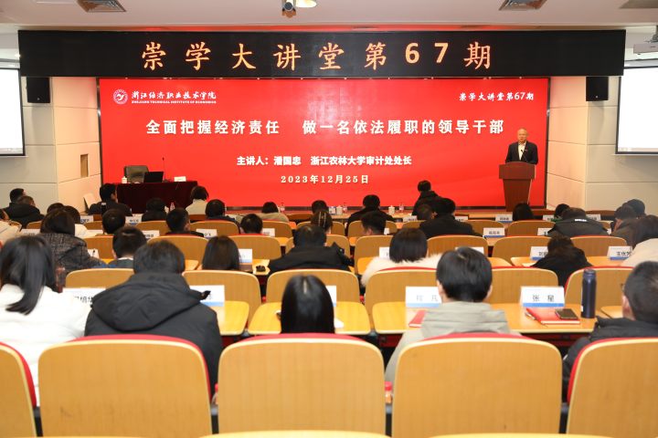 为深入学习贯彻党的二十大精神和习近平总书记关于从严管理监督干部、加强审计监督重要论述精神,充分发挥经济责任审计在干部监督管理中的独特作用,扎实推进“四治四促”作风建设专项行动。12月25日下午,第67期崇学大讲堂特邀浙江农林大学审计处处长、高级经济师、浙江省综合性评标专家库评审专家、浙江省政府采购评审专家潘国忠来我校作经济责任审计专题讲座。校领导、全体中层干部、校属企业法定代表人、其他重要岗位人员聆听了讲座。讲座由党委副书记、工会主席吕红刚主持。