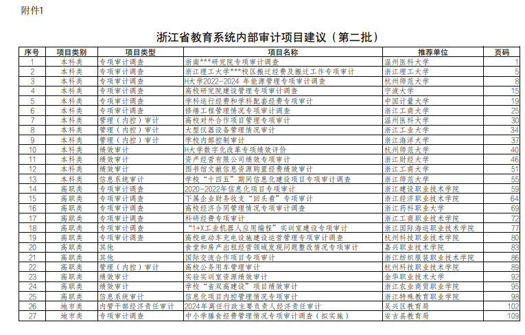 该建议名单由浙江省内部审计协会教育系统委员会组织评选,面向全省教育系统推广优秀项目在审计理念、组织方式、技术方法、成果运用等方面的宝贵经验。旨在贯彻落实习近平总书记关于加强审计监督工作的重要指示精神,持续增强审计监督的宏观性、精准性和实效性,切实发挥内部审计在服务决策、规范管理、防范风险、促进发展方面的重要作用。